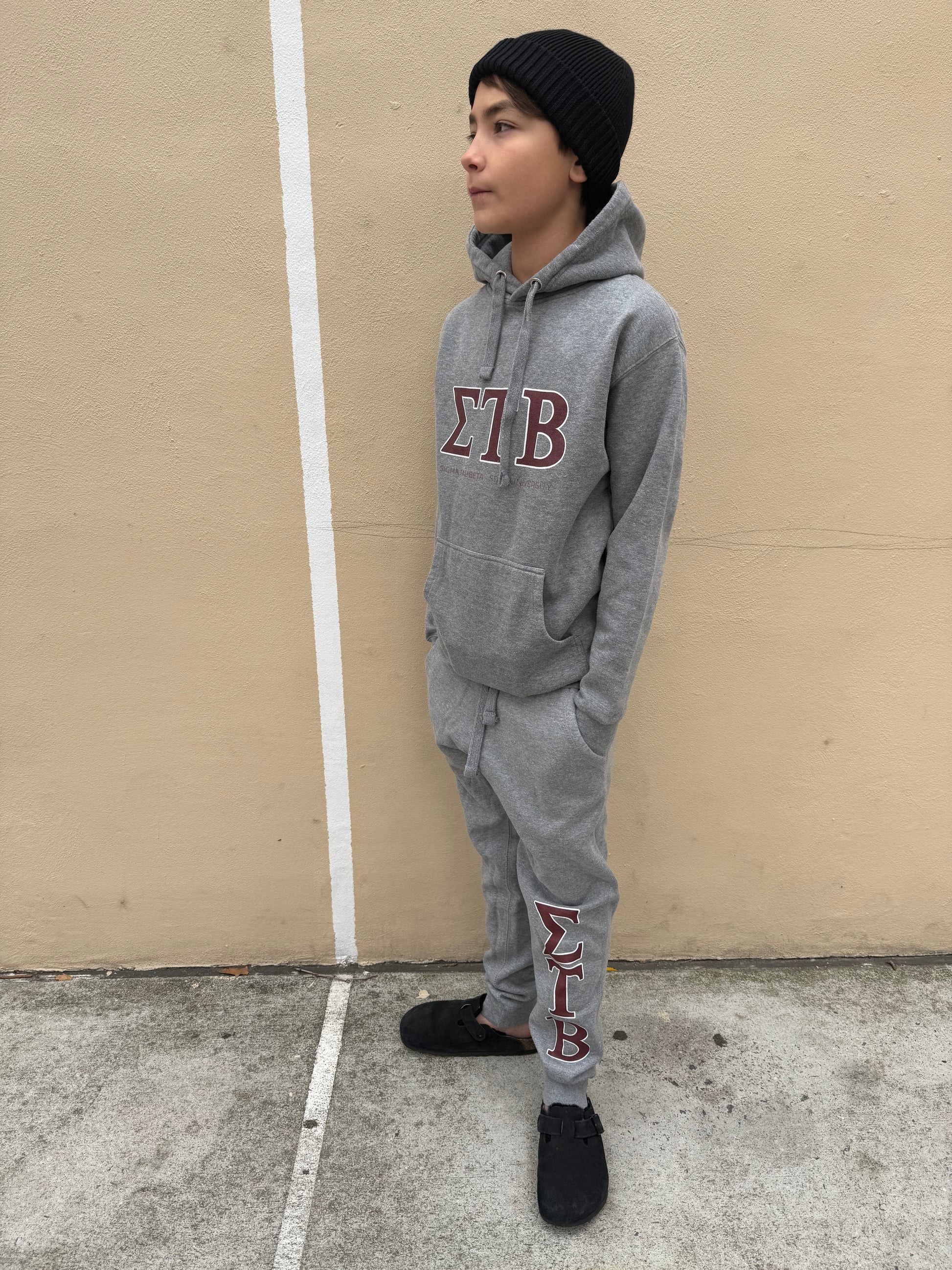 Large front DTG print, new "ΣTΒ" (Sigma Tau Beta) logo as a play on timeless Fraternity/Sorority hoodies and tracksuits.
