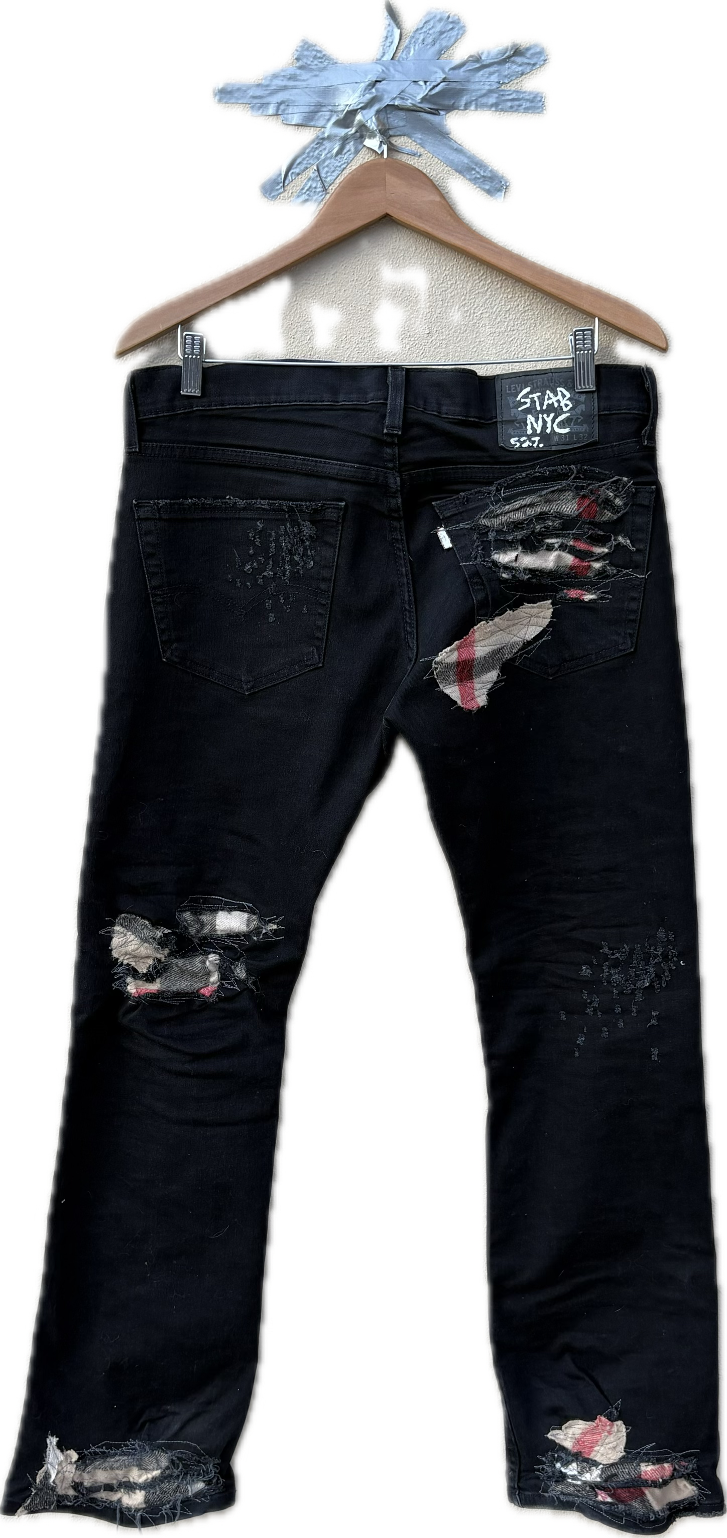 1:1 Reworked jeans lined with Burberry scarf inspired material patchwork and details all over.